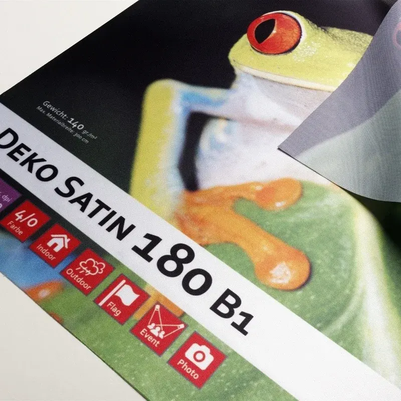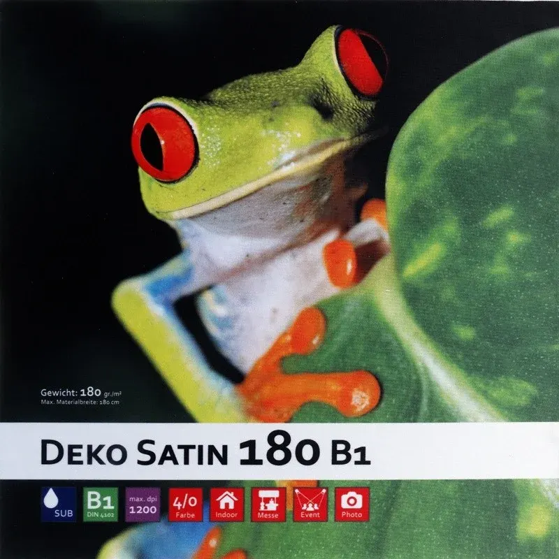 Unser Deko Satin B1 im Dyesub-Druckverfahren (Sublimation) bedruckt. Durch dieses Druckverfahren erhält dieses Material ein brilliantes, wetter- und kratzfestes Druckbild mit einer kräftigen und leuchtenen Farbwiedergabe. Das Material ist zudem für den Einsatz im Innen- und Außenbereich geeignet. Unser Deko Satin ist natürlich B1 zertifiziert.