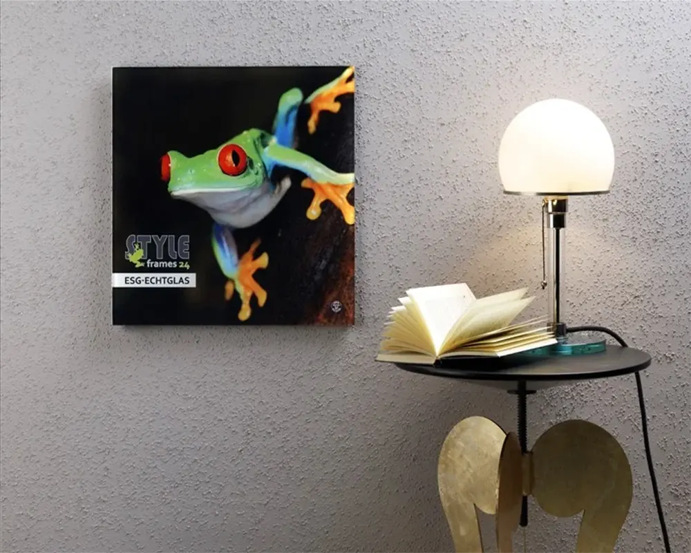 Der kristallklare Glanz von unserem ESG-Glas, die erstklassige Farbbrillanz der UV-Farben und die elegante Optik Ihres Motives werden Sie begeistern.