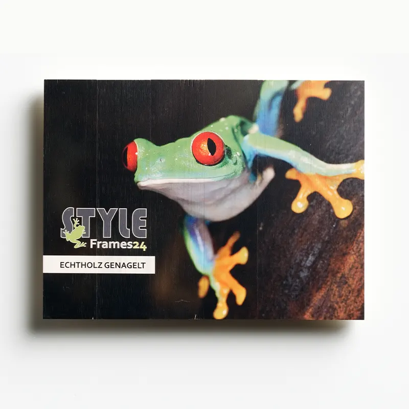 Eine Variante zu unserem Echtholz gebürstet ist der Druck auf unserem Echtholz genagelt. Rückseitig halten wir die bedruckten Einzelbretter mit vernagelten Querleisten zusammen. Eingelassene, gezahnte Halbkreise sorgen hier für die Möglichkeit, den Druck überall aufzuhängen.