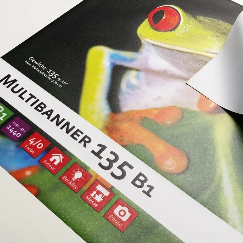 Unser Multibanner 135 B1 wird mit UV-Tinte im Digitaldruck bedruckt. Durch dieses Druckverfahren erhalten alle PVC-Banner ein brilliantes, wetter- und kratzfestes Druckbild und sind somit besonders für den Einsatz im Innen- und Außenbereich geeignet. Unser Multibanner ist natürlich B1 zertifiziert.